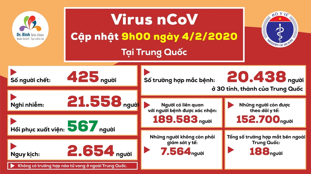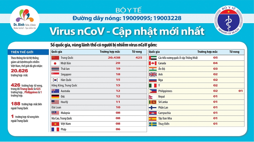 Thế giới: 20.627 người mắc, 426 người tử vong, trong đó Trung Quốc 425 người tử vong, Phillippines có 01 trường hợp tử vong.