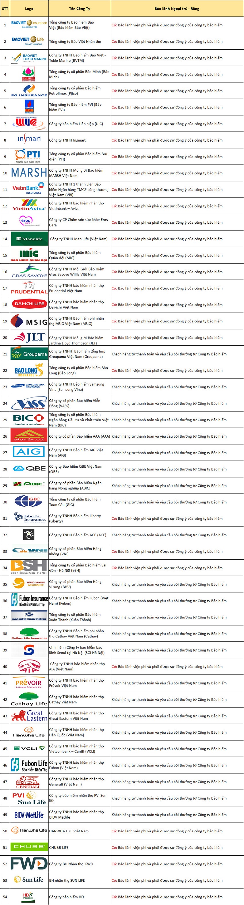 DANH SÁCH CÔNG TY BẢO HIỂM ĐỐI TÁC