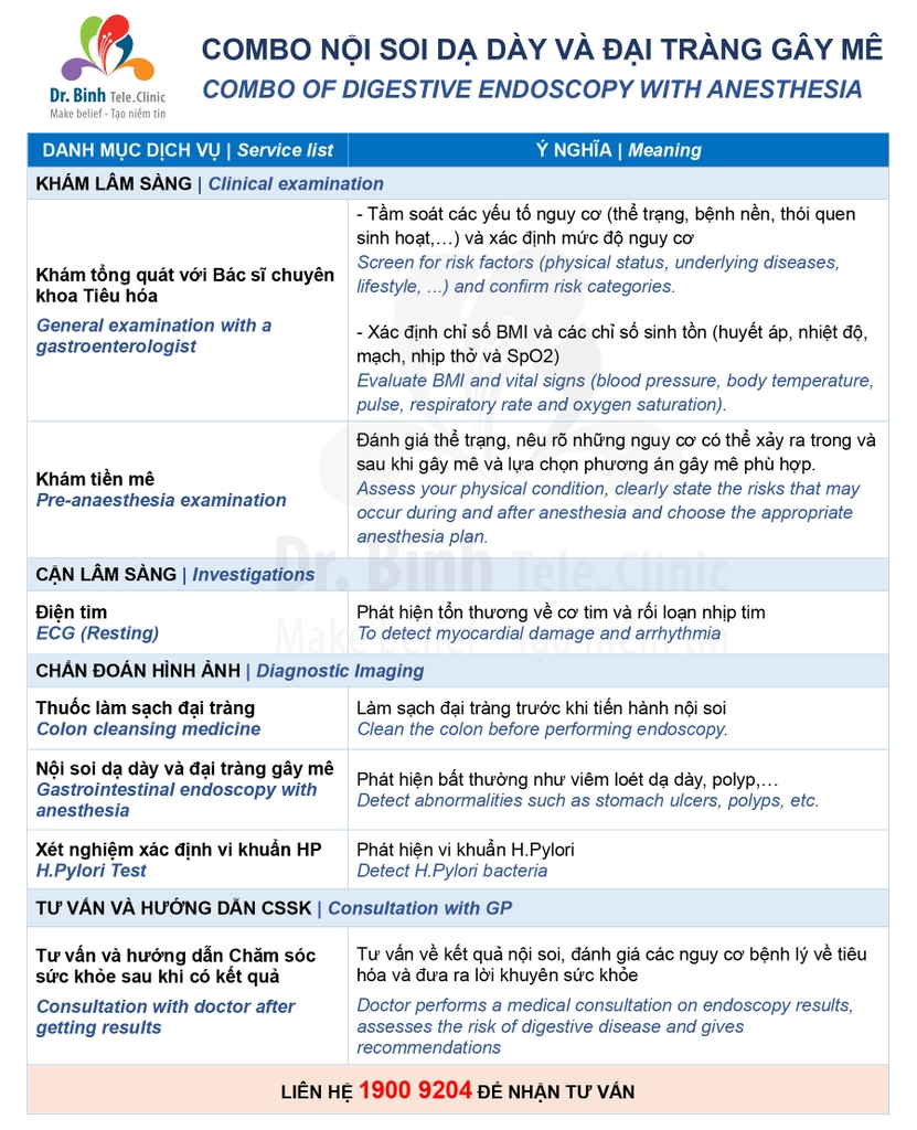 Tại Dr. Binh Tele_Clinic, chúng tôi cung cấp dịch vụ thực hiện cả hai loại nội soi này đồng thời trong một lần thăm khám, mang lại nhiều lợi ích thiết thực cho bệnh nhân. Đây đang là xu hướng rất phổ biến ở những người có nhu cầu nội soi tiêu hóa.