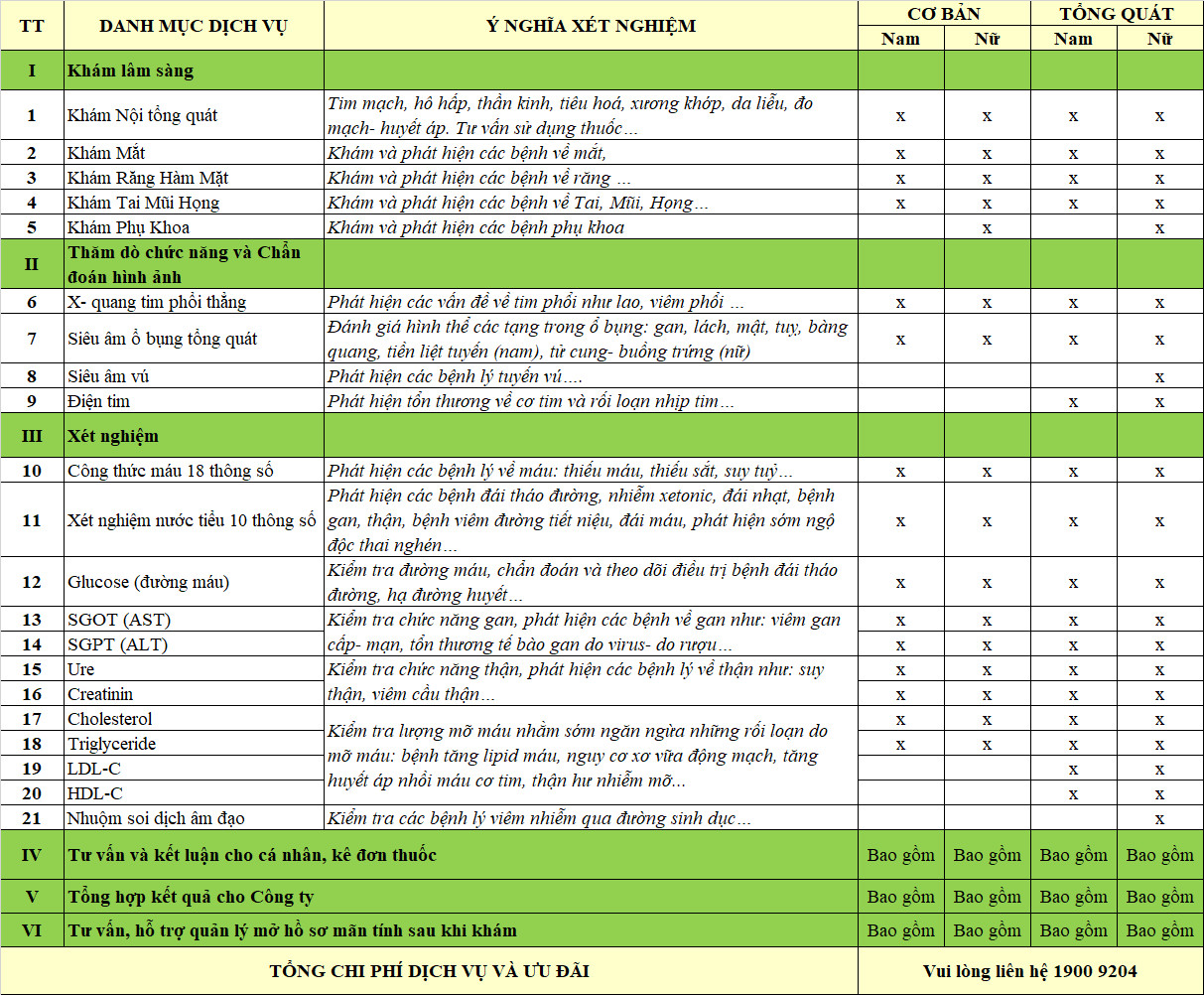 + Giá khám trọn gói có thể thay đổi tùy thuộc vào từng thời điểm và nhu cầu thực tế của quý đơn vị. vui lòng liên hệ 19009204 để được tư vấn chi tiết