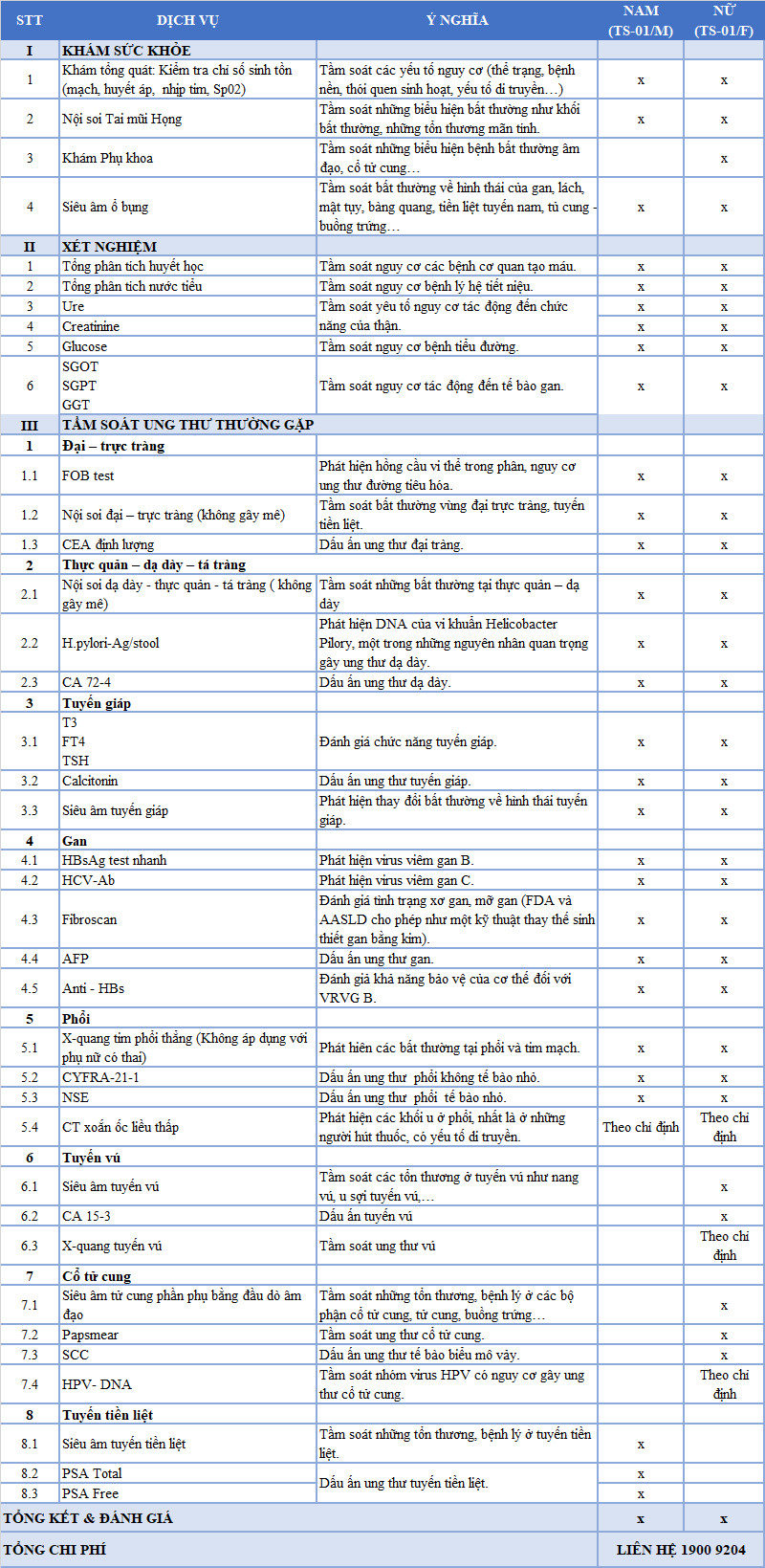 Với chi phí tầm soát hợp lý, Gói tầm soát ung thư chuyên sâu dành cho Nam/ Nữ tại Dr. Binh Tele_Clinic bao gồm các hạng mục.
