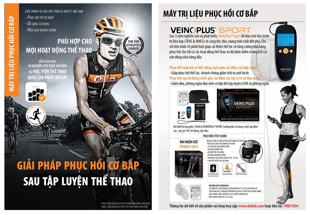 Sử dụng máy trị liệu phục hồi cơ bắp VEINOPLUS SPORT hoàn toàn có khả năng hồi phục toàn bộ phần cơ bắp nhờ vào sự kích thích điện các cơ làm cơ co thắt. Là thiết bị y tế nhập khẩu trực tiếp từ Pháp và tuân thủ tiêu chuẩn 93/42/EEC về thiết bị y tế, VEINOPLUS SPORT được phát triển với mục đích tăng cường khả năng phục hồi sau vận động đặc biệt dành cho những người hay tập luyện thể thao. Đặc biệt là làm tăng tuần hoàn máu, giảm đau, thư giãn cơ, tăng loại bỏ các chất chuyển sinh ra do luyện tập cường độ cao (như axit lactic), phòng ngừa chuột rút, phục hồi thể lực.