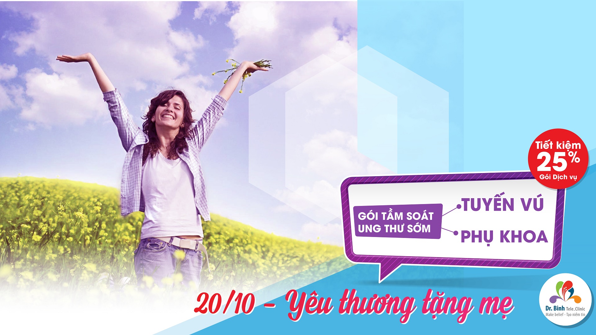 Nhân ngày Phụ nữ Việt Nam 20/10, Phòng khám đa khoa Dr.Binh Tele_Clinic dành tặng nửa thế giới gói tầm soát ung thư vú và ung thư phụ khoa với ưu đãi hấp dẫn. Quý khách tới phòng khám đa khoa Dr.Binh Tele_Clinic từ ngày 17-20/10/2016 sẽ được nhận ưu đãi 25% cho gói tầm soát ung thư vú hoặc ung thư phụ khoa chỉ còn 725.000 đồng và 895.000 đồng.