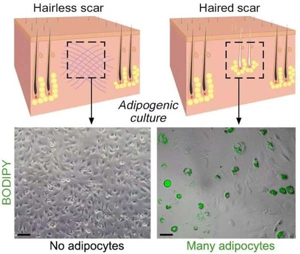 Các chuyên gia cho biết, tế bào nang lông khi được kích thích sẽ phát ra tín hiệu dưới dạng protein hình thái (BMP). Chính protein này có thể biến các tế bào nguyên sợi thành chất béo. Và nếu dùng protein này trong quá trình phục hồi vết thương, da có thể liền lại mà chẳng hề có sẹo.