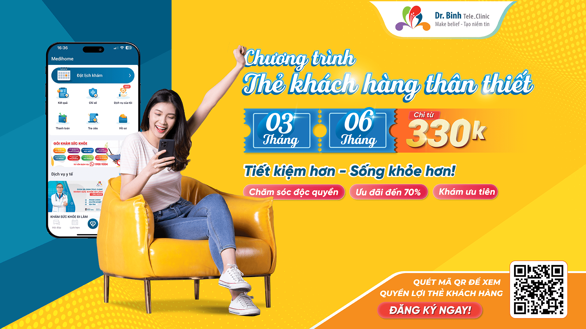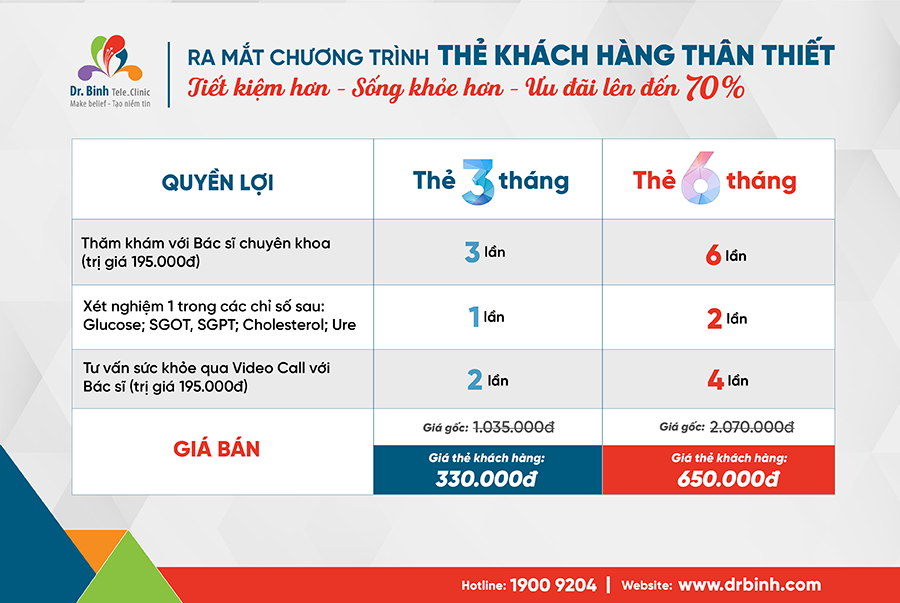 Việc ra mắt chương trình thẻ khách hàng thân thiết chính là một mảnh ghép hoàn hảo trong hệ sinh thái dịch vụ của Dr. Binh Tele_Clinic với rất nhiều tiện ích thiết thực. Với 2 loại thẻ 3 tháng & 6 tháng, khách hàng sẽ nhận được những đặc quyền khác nhau cùng mức giá ưu đãi hấp dẫn so với việc khám dịch vụ lẻ tại phòng khám.