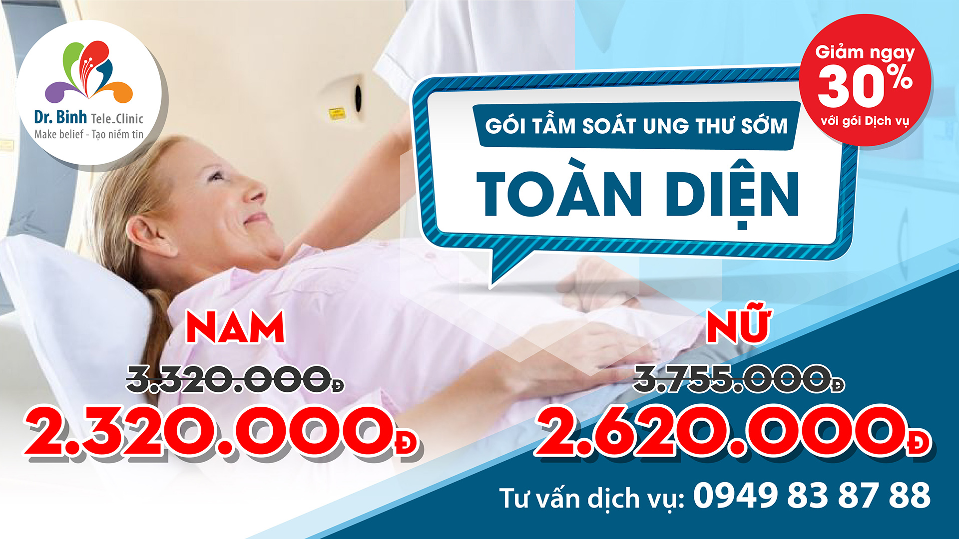 Gói tầm soát ung thư sớm toàn diện đang là một lựa chọn thông minh của rất nhiều khách hàng coi trọng sức khỏe bản thân và gia đình. Với chương trình tri ân mừng sinh nhật của Phòng khám đa khoa Dr.Binh Tele_Clinic ưu đãi tới hơn 30%++, tầm soát 7 loại ung thư với Gói tầm soát Ung thư sớm toàn diện cho Nam chỉ còn 2.320.000 VNĐ (Giá niêm yết 3.320.000 đồng). Gói tầm soát ung thư sớm toàn diện cho Nữ chỉ còn 2.620.000 VNĐ (GNY 3.755.000 VNĐ).