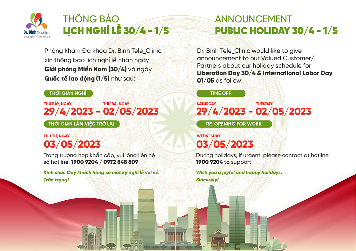 Nhằm đảm bảo Quý khách hàng luôn chủ động trong kế hoạch thăm khám & điều trị bệnh lý, Phòng khám Dr. Binh Tele_Clinic trân trọng thông báo lịch nghỉ lễ Giỗ tổ Hùng Vương (10/03), Giải phóng Đất nước (30/04) và Quốc Tế Lao Động (01/05):