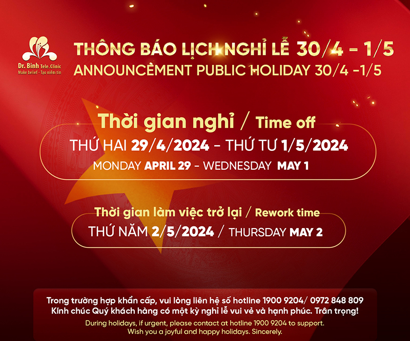 Trong dịp này, Phòng khám Đa khoa Dr. Binh Tele_Clinic trân trọng thông báo tới quý khách về lịch nghỉ lễ như sau: