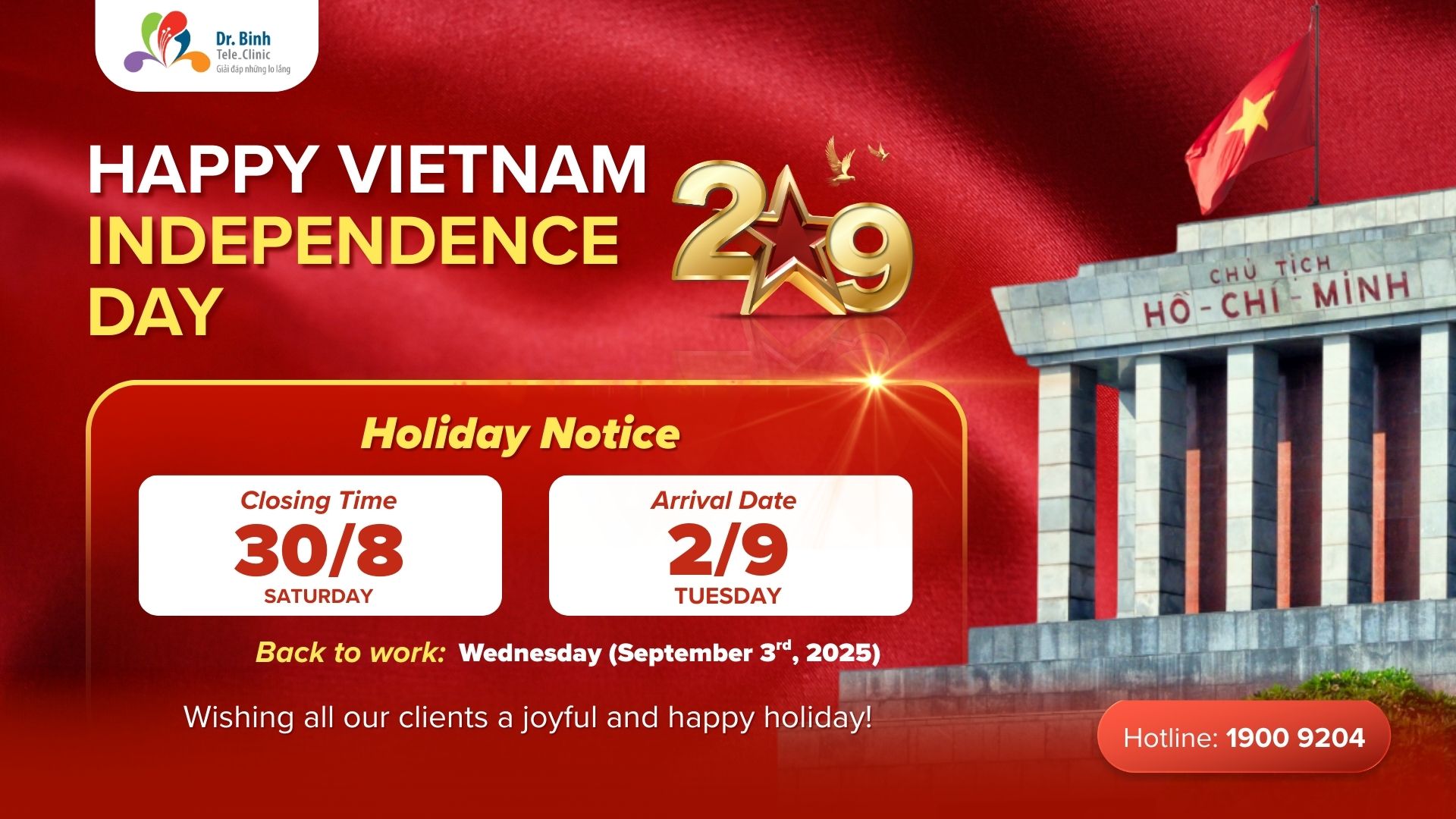 Phòng khám Đa khoa Dr. Binh Tele_Clinic thông báo lịch nghỉ lễ Quốc khánh 2/9/2025 như sau: