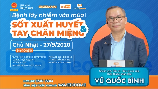 Chương trình truyền hình trực tiếp tư vấn sức khỏe chủ nhật tuần này với chủ đề “bệnh lây nhiễm vào mùa: Sốt xuất huyết và tay chân miệng” khách mời của chương trình là TS. BSCC. Thầy thuốc nhân dân VŨ QUỐC BÌNH - Giám đốc Trung tâm nghiên...