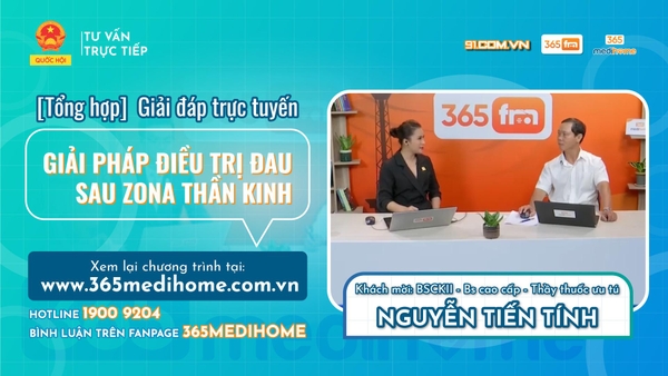 Hàng trăm câu hỏi của khán - thính giả về chủ đề đau sau Zona thần kinh gửi đến đã được chuyên gia là Thầy thuốc ưu tú. BS. CK2. Nguyễn Tiến Tính giải đáp trong buổi tư vấn sức khỏe trực tiếp “Điều Trị Đau Sau Zona Thần Kinh” diễn ra ngày 14/08 do Phòng khám đa khoa online 365 Medihome phối hợp với kênh Truyền hình Quốc hội Việt Nam tổ chức.