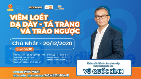 Quý vị cũng có thể được TS.BSCC.TTND VŨ QUỐC BÌNH tư vấn trực tiếp về "BỆNH VIÊM LOÉT DẠ DÀY TÁ TRÀNG VÀ TRÀO NGƯỢC” hoàn toàn MIỄN PHÍ. Hãy gửi tất cả những câu hỏi, thắc mắc về bệnh tới hotline 19009204 nhánh 1 và đón xem chương trình tư vấn phát sóng trực tiếp trên kênh truyền hình Quốc hội Việt Nam vào hồi 09h00 – 10h30 Chủ nhật ngày 20/12/2020.