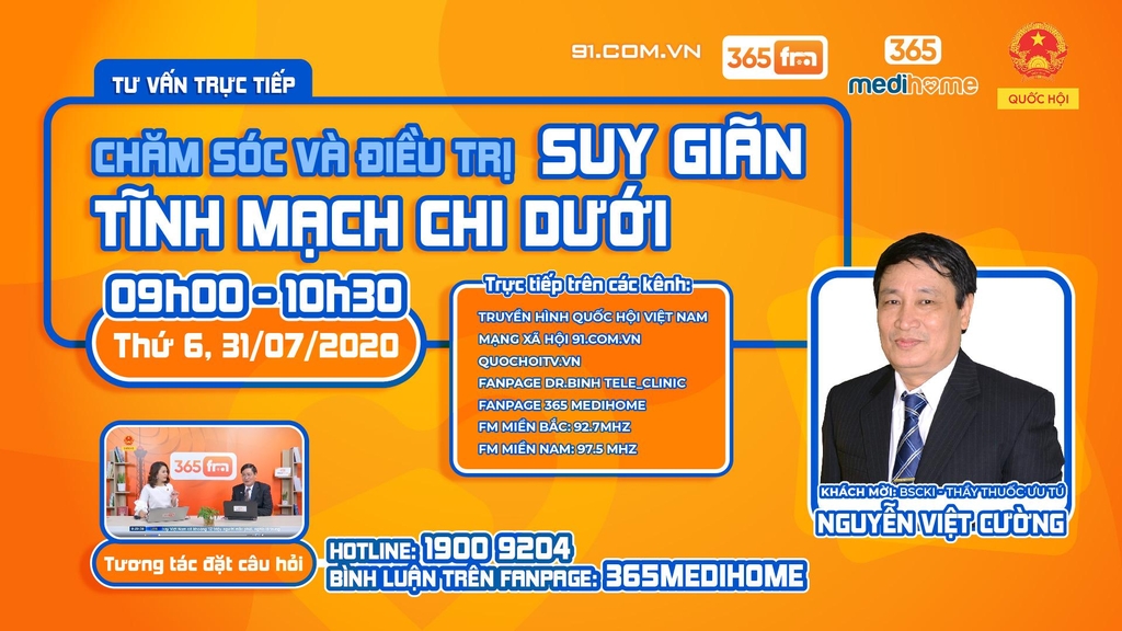 Tuy nhiên đối với những người bị bệnh suy giãn tĩnh mạch đừng quá lo lắng, tất cả những thắc mắc hãy gửi về cho chương trình. Các chuyên gia sức khỏe hàng đầu tại Việt Nam – Phòng khám đa khoa online 365 medihome; BSCKI – Thầy thuốc ưu tú NGUYỄN VIỆT CƯỜNG; sẽ tư vấn về “Cách chăm sóc và điều trị bệnh suy giảm tĩnh mạch chi dưới” trên chương trình truyền hình trực tiếp phát sóng vào hồi 09h00 – 10h30, thứ 6 ngày 31/07/2020.