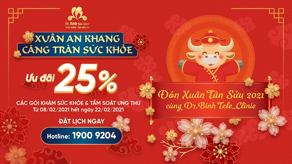 ƯU ĐÃI MỪNG XUÂN - ĐÓN LỘC ĐẦU NĂM 2021 CÙNG DR.BINH TELE_CLINIC. Từ ngày 08/02/2021 đến hết ngày 22/02/2021, phòng khám xin gửi tặng ưu đãi 25% toàn bộ gói khám sức khỏe cá nhân và tầm soát ung thư.