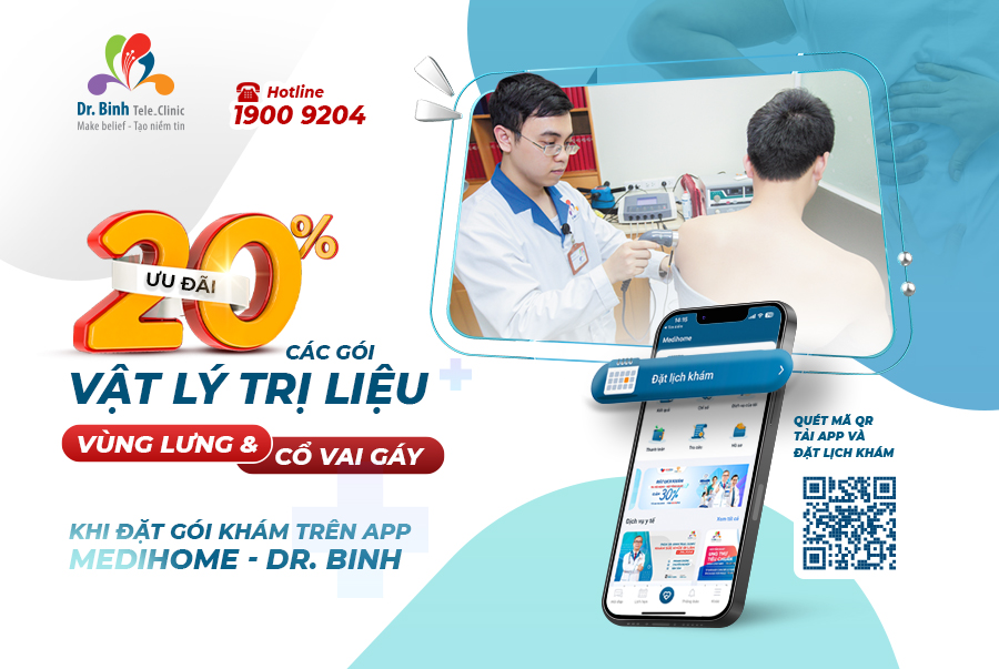 Bên cạnh đó, Dr. Binh Tele_Clinic cũng tiên phong áp dụng nhiều phương pháp trị liệu tiên tiến nhất, giúp người bệnh nhanh chóng phục hồi, hạn chế tối đa di chứng và nâng cao chất lượng cuộc sống. Tại phòng khám Dr. Binh Tele_Clinic, người bệnh sẽ được trải nghiệm dịch vụ chăm sóc chu đáo, hướng dẫn bài bản và kênh kết nối, liên lạc với chuyên gia 24/7 thông qua nền tảng y tế số Medihome.